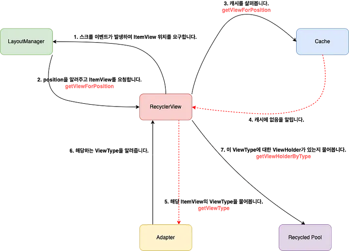 ViewHolder를 그리기 위한onCreateViewHolder호출 LayoutManager가addView를 호출해itemView를position에 잘 붙인 후RecyclerView에게 알리면RecyclerView는Adapter에게onViewAttachedToWindow호출