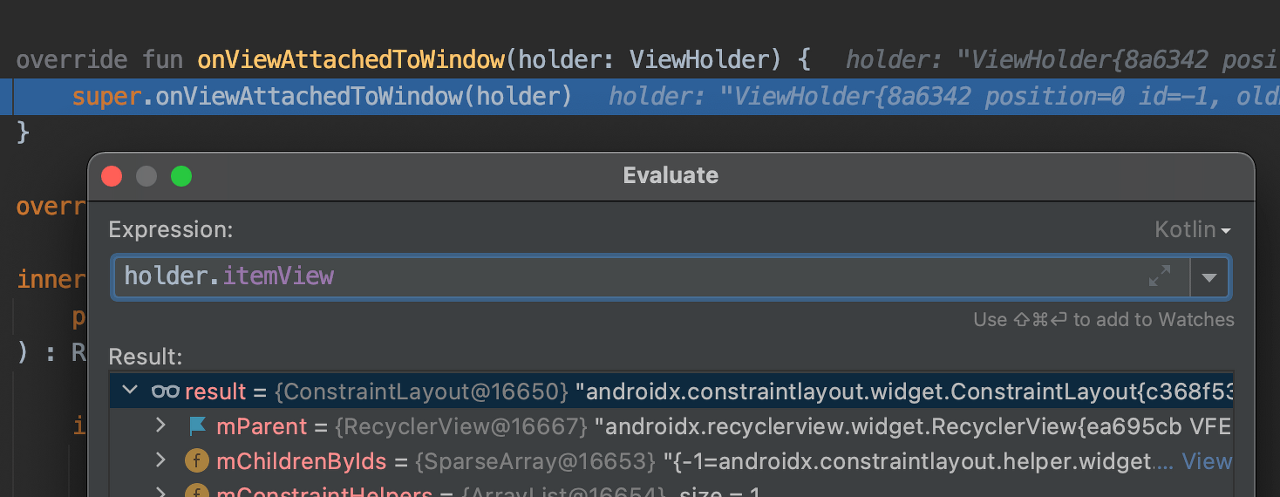 RecyclerView.ViewHolder를 통한LifecycleOwner탐색 시 2가지 사실을 알 수 있었다.ViewTreeLifecycleOwner.get에서parent를 반복적으로 호출하면서LifecycleOwner를 소유하는 객체를 찾는다onBindViewHolder단계에서는RecyclerView의 child로 추가되지 않는다