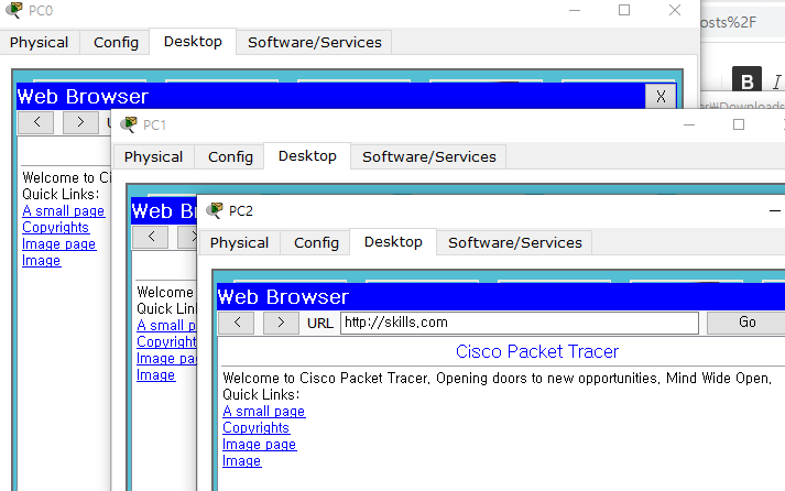 - 각 PC에서 웹브라우저를 열고 “http://skills.com"에 접속하여 아래와 같이 접 속 되는지 확인하시오 (“http://skills.com" 사이트는 IDC_Server에 미리 구성되있음).