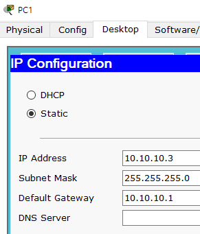 ㆍPC의 경우 R1(Fa0/1) 주소가 10.10.10.1/24 이므로 해당 주소가 PC 2대의 게이트웨이