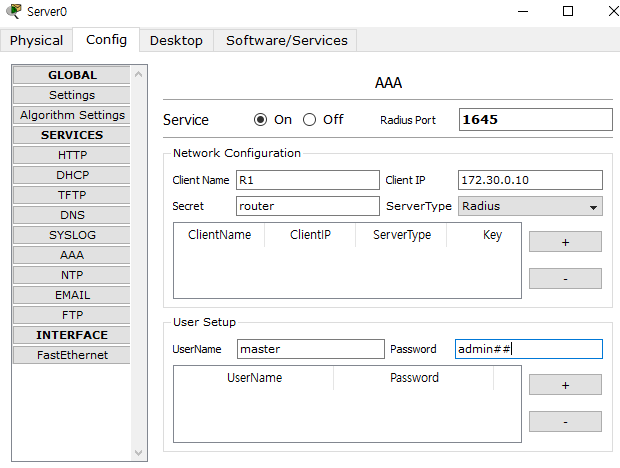 ㆍ라우터 R1에 콘솔및 텔넷 접속시 Server0에 Radius 인증을 받아 접속하여야 하며 이때 사용되는 ID는 "master" , 패스워드는 "admin##"이 되도록 Server0을 설정하시오.key 값으로 "router"를 사용한다.