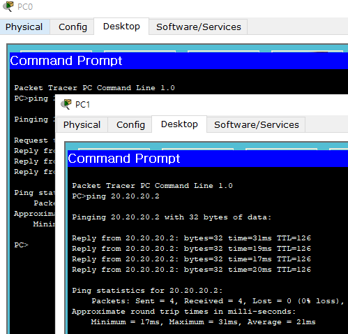 ㆍPC0의 경우 웹서버에 접속 해야하므로, DNS Server주소에 Server0 주소인 20.20.20.2를 입력