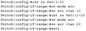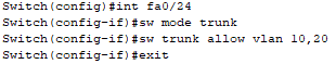 - Switch2 트렁크 할때 VLAN 10,20만 Data가 전송되도록 설정하시오.