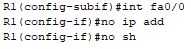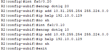 - R1과 R2의 Fa0/0 포트에 서브인터페이스(Sub-Interface)를 구성하시오. 서브 인터페이스 이름은 각 VLAN의 ID 값을 사용하고 위 『나 IP 주소 및 장치 설정 → IP 주소 할당』 항의 표를 참고하여 IP 주소를 설정하시오(예. “VLAN 100"의 서브인터페이스 이름은 ”Fa0/0.100“으로 구성).